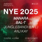 Celebrate the arrival of 2026 at Ambassy. Leave your New Year’s resolutions at home and hit the dance floor for an unforgettable night of live music and high-octane DJ sets, featuring MANARA, BAL-T, JUNGLEBANDI (LIVE) and ANJ KAY.