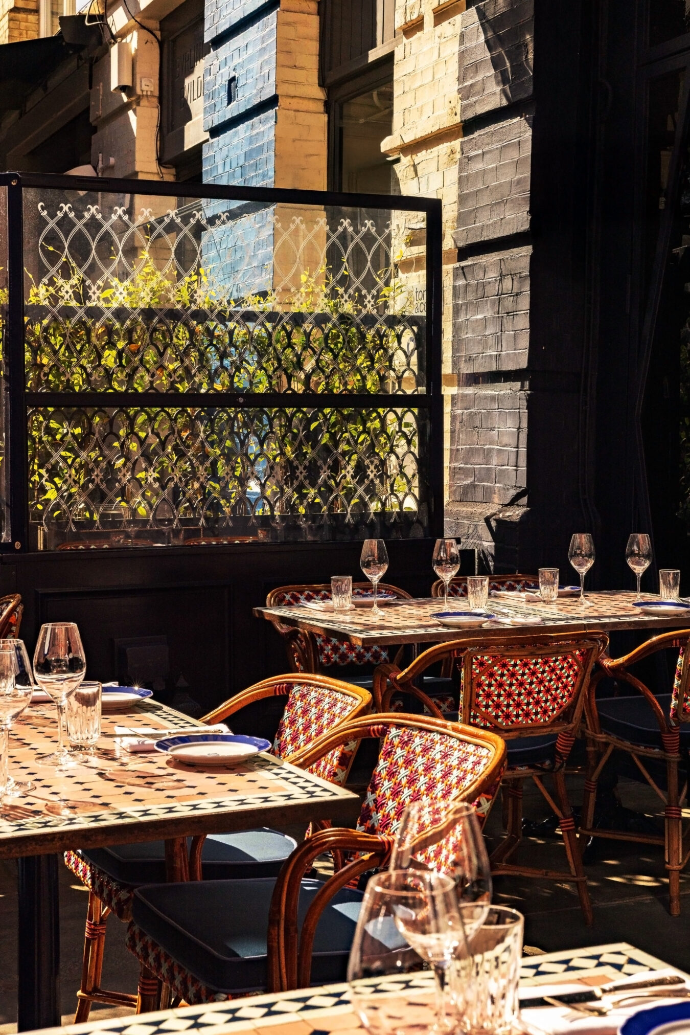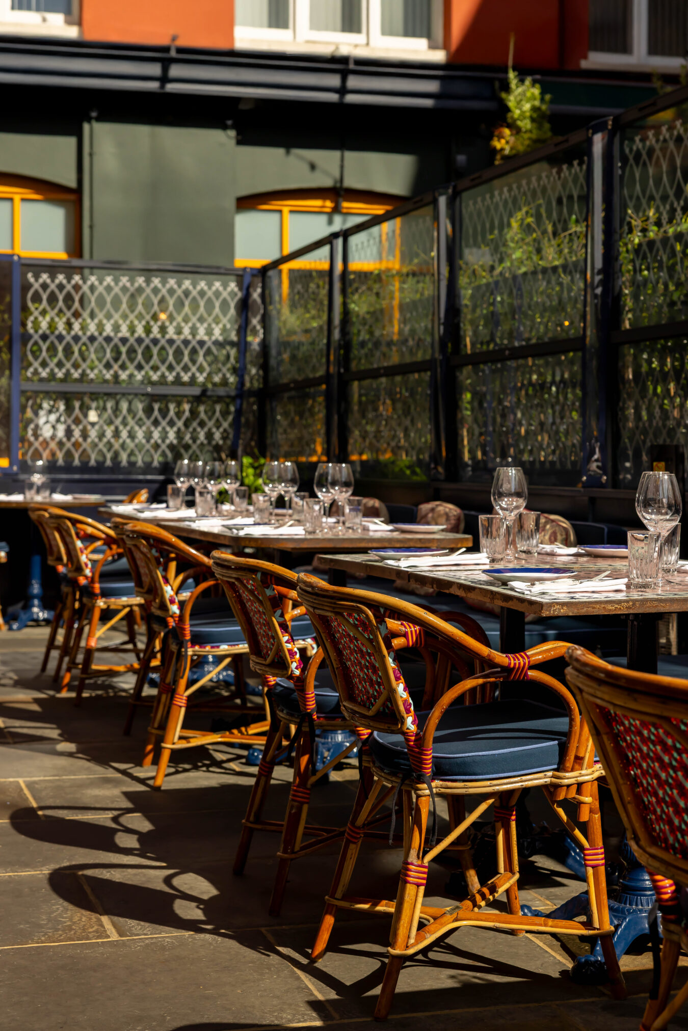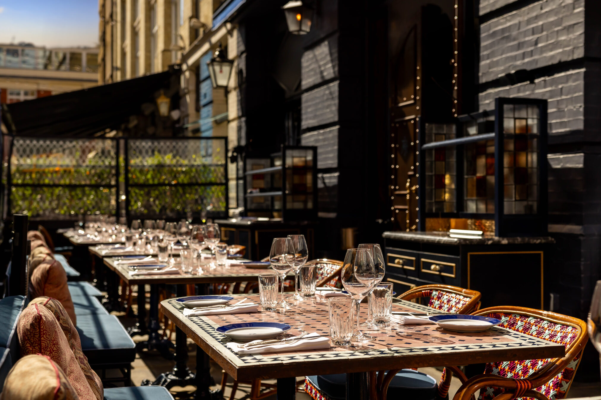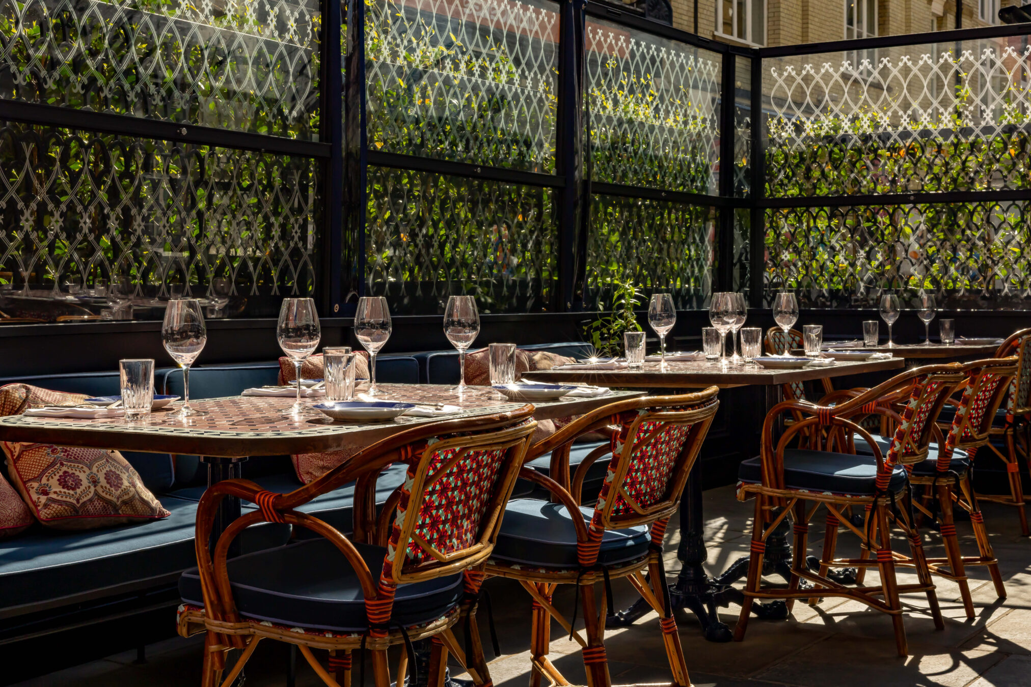 An outdoor dining spot in the heart of Mayfair, open all year round with heating and an awning over the space. The Verandah takes its cues from the Ambassador’s original residence, replicating the mosaic-topped tables and jasmine plants.