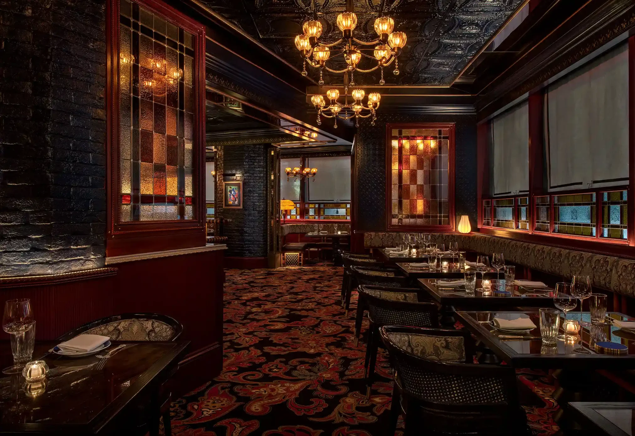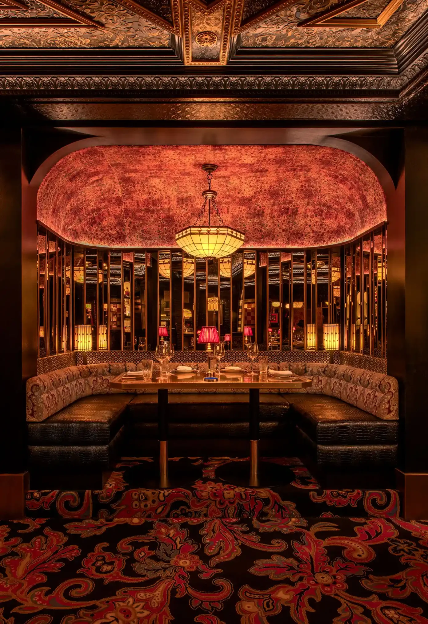 Located on the Lower Ground Floor, The Jungli Room is a semi-private space with a warm, immersive atmosphere. This space features low lighting, elegant gold accents, and a distinctive patterned ceiling to create an intimate setting, ideal for smaller gatherings that call for a sense of intimate occasion.