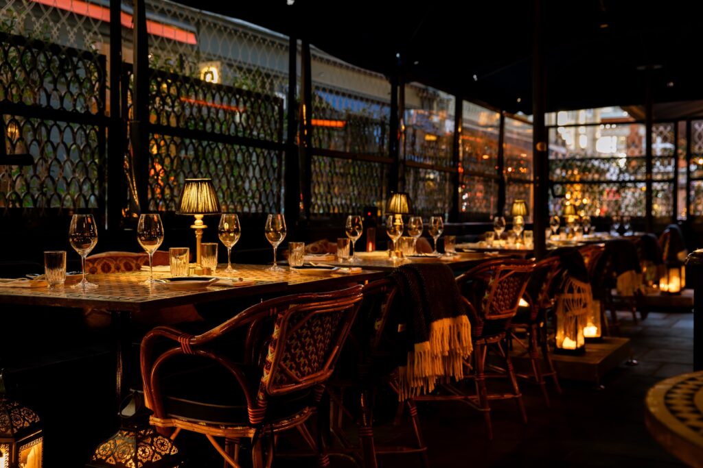 The room features bespoke handmade tiles salvaged from Indian party mansions, with the unique blend of traditional and Art Deco styles creating a vibrant, convivial atmosphere.